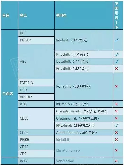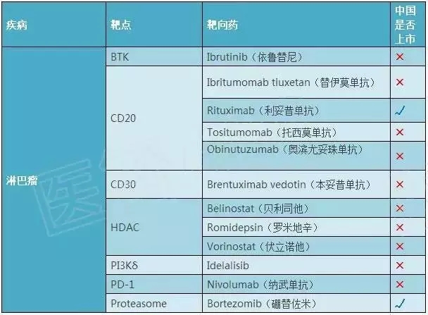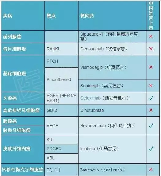 来源:医蟹;参考资料:美国FDA新药和仿制药注册与《新康界》史上最全癌症靶向药(2016版) 自我国药品审评审批制度调整以后,曾在国外获得批准的新药进入国内市场明显加速。由2016年起,截止到2017年第一季度,根据疾病种类和药物靶点,我们将靶向药物及其在中国的上市情况进行了汇总。 未在中国上市的药物尚无正式中文名称,文中提供的中文名为音译,仅供参考。 肺癌靶向药 乳腺癌靶向药 结直肠癌靶向药 白血病靶向药 淋巴瘤靶向药 甲状腺癌靶向药 黑色素瘤靶向药 肾癌靶向药 胃癌靶向药 胃肠道间质瘤靶向药 肝癌靶向药 食管胃结合部癌靶向药 多发性骨髓瘤靶向药 胰腺癌靶向药 妇科癌症靶向药 软组织肉瘤靶向药 其他癌症靶向药 |