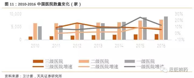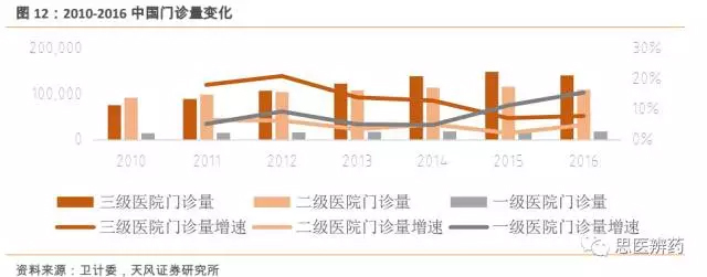 注:2015年与2016年医院数量卫计委只有1-11月数据,但不影响整体趋势和判断。 2010-2014年三级医院的门诊量增长均超过10%,自2015年开始增速下滑,2016年增长被一级医院增速超越,随着分级诊疗持续覆盖,该趋势会继续扩张。