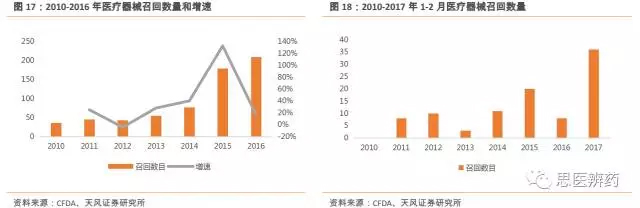注:上图包括其他二类和三类医疗器械产品,但体外诊断CFDA证占医疗器械注册证的大部分数量。 除了注册和临床,CFDA的监管威慑到整个行业,产品的召回也逐渐成为常态。召回现象在美国是非常普遍的现象,产品的召回说明了企业的自查能力在不断提升,除了应对监管压力,企业的产品和质量控制能力也在不断提升,行业的规范化向好发展。 2015年开始各厂家召回速度明显提升,2017年1-2月表现更甚,召回数量也大大增多。