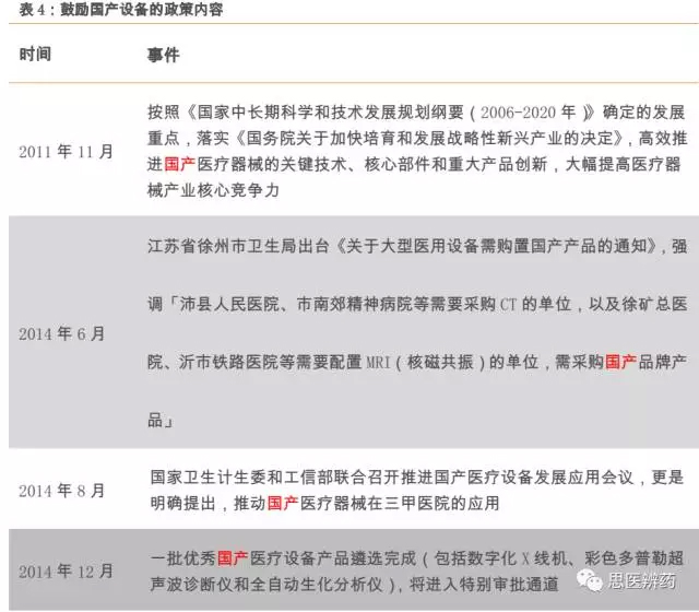 我们认为未来医疗器械注册证,尤其是三类证,会逐渐变得稀缺。尤其是对于临床数据的核查,其检测力度和惩罚强度都远高于任何一个历史时段。在这个过程中,也许会误伤、误杀一些优秀的公司,但是对于行业的玩家,对质量控制、注册流程和法规都提出了更高的要求,是挑战也是机遇。 国产器械受益于国家国产器械进口替代政策,宏观环境良好 尽管如上文所说,注册监管门槛提升,但是对于优质的国产品牌而言却是巨大的机会。多年来,国家对于国产品牌都给予了政策扶持。在某些省份,如四川,要求二级以下医院必须采购国产设备,引起广泛热议。目前国产设备依然还有进步的空间,在一刀切的国产替代操作层面纵然还有一些难度,但是趋势和发展的方向已经一目了然。