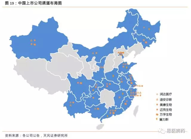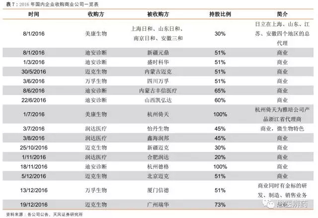 国内渠道加速整合,未来3年是重要窗口期,本质是客户资源的圈地 国内体外诊断公司,在登录资本市场后,主要并购方向集中在国内销售渠道和产品的并购。由于近几年两票制和营改增等对于渠道的管控加强,2015-2016年并购的热点主要集中在渠道的并购。国内体外诊断产品刚刚起步,短期内性能的差异化不显著,因此对于终端的把控决定了产品的销售。 因此在2015-2016年度,各大上市公司开始快速布局销售网络,通过并购渠道来瓜分市场份额。随着两票制政策的落地,渠道流通的大洗牌以前所未有的速度在推进。在药品两票制完善后,高值耗材和体外诊断将是下一个要整改的方向。未来体外诊断的配送将快速提高门槛,比如企业规模、销售品类、GSP资格认证等等都对企业的规范性有了新的要求。对于渠道自身来说,未来政策的不确定性也使得渠道和代理商倾向于背靠上市公司,用于回避未来政策的不确定性带来的风险。