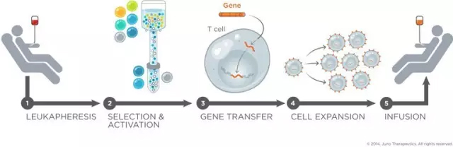CAR-T细胞治疗流程图(来源:JUNO 官网) 当然除了CD19 之外,还有Juno以CD28为共刺激结构域的CAR-T产品(CD28zCAR)JCAR015。但是临床试验并不顺利,因发生5起死亡事件。2017年3月,Juno宣布放弃其以CD28为共刺激结构域的CAR-T产品(CD28zCAR)JCAR015,转而重点发展同样为CD19靶点、以4-1BB为共刺激结构域的CAR-T产品(4-1BBzCAR)JCAR017及JCAR014。 有研究表明,CD28与4-1BB相比存在重大缺陷:CD28的特点是刺激CAR-T细胞在体内迅速扩增,但同时也使得细胞迅速耗竭,复发率较高;4-1BB的技术特点是细胞体内扩增相对温和,但存续时间更长,复发率也更低。所以Juno此举也标志细胞治疗行业未来将加速淘汰CD28zCAR,全面转向4-BBzCAR。