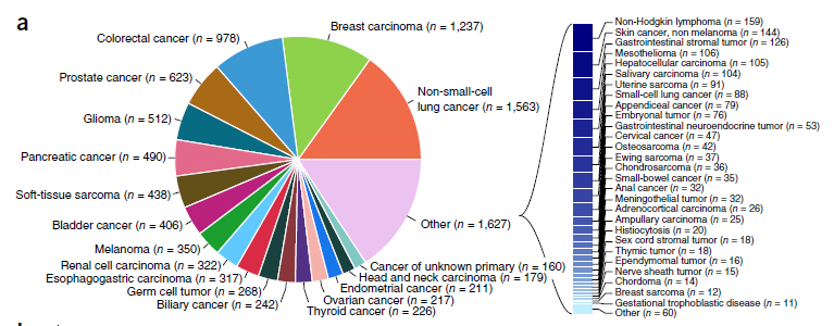 MSK-IMPACT的工作流程 首先来看看什么是MSK-IMPACT。这项技术是科学家们在纪念斯隆-凯特林癌症中心开发,是一种基于NGS panel的杂交捕获技术,可检测与癌症相关的341个基因中的所有蛋白质编码突变、拷贝数变异、启动子突变以及结构重排。不过根据最新的发现,目前这种方法已经能够检测与癌症相关的410个基因。 从MSK-IMPACT的工作流程图我们可以看到,患者首先要签订肿瘤与正常序列配对分析的知情同意书,然后研究人员收集患者的血液样本作为正常DNA的来源,利用自动化的方法来提取肿瘤和血液样本的DNA,并使用靶向410个基因的所有编码外显子的杂交探针来制备文库,随后是测序、数据分析。所生成的数据结果加载到自家开发的基因变异数据库中,并手动检测数据的质量和精度。基因组变化会在电子病历报告中显示,并被发送到机构开发的数据库中,这有利于自动化临床试验匹配,变异数据还会自动上传到cBioPortal中进行挖掘以及解读。 300多种肿瘤生成了无与伦比的数据集 自从该方法在CLIA实验室中开发以来,研究人员们已经使用它对上万名各类实体肿瘤患者进行测序。他们最关键的研究思路就是:利用正常组织与肿瘤组织相匹配,以汇编各个肿瘤的体细胞突变目录。从这个方向努力,研究人员终于生成了一个无与伦比的数据集。这个数据集包含了晚期癌症患者的癌变组织和正常组织的DNA序列、相关病理与临床注释数据。成熟的临床治疗反应和疾病相关的注释结果,使得这个数据集对确定新的生物标志物以及预测后续治疗反应有重要的意义。