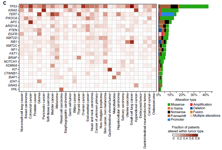 10336例患者的肿瘤分布图 上图勾勒了本文中成功测序的10336例患者的肿瘤分布类型,包含62种主要肿瘤类型,又细分为361种类型。 与以往的大规模基因组鉴定研究不同,这项研究所涉及的数据全部来自晚期患者,他们最有可能是分子靶向治疗的代表人群。另外,这项研究包含了300多个详细的肿瘤类型,这有助于人们理解驱动突变在所有癌症中的发生率,还有助于检测罕见以及不曾预料到的临床可行性突变。 常见肿瘤的复发性体细胞突变