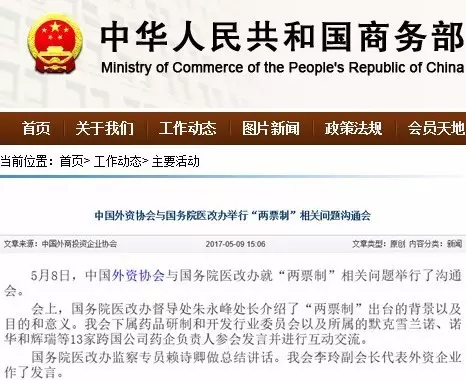 自2017年1月9日,国务院医改办发布《关于在公立医疗机构药品采购中推行“两票制”的实施意见(试行)》以来,4个月过去了。近期,包括医改办在内的相关部门再加紧搜集一线信息,种种迹象表明,两票制政策或有进一步的调整、完善。 医改办就“两票制”,约诺华、辉瑞等外企 来自商务部的消息,5月8日,中国外资协会与国务院医改办就“两票制”相关问题举行了沟通会。