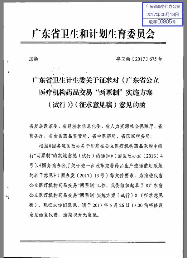 近日,一份名为《广东省公立医院医疗机构药品交易“两票制”实施方案(试行,征求意见稿)》(以下简称征求意见稿》,的文件在网上流传,如果这份文件属实,那在继全国多个省市相继发布“两票制”的实施方案后,广东省的“两票制”也要来了!