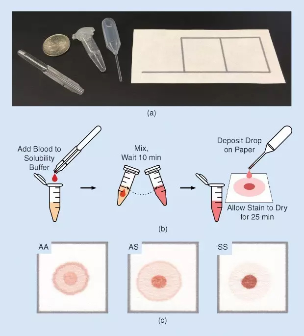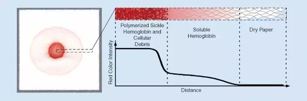 每年,全球有数十万患有镰状细胞疾病的孩子降生,这是一种遗传性的疾病,会影响到血液中的血红蛋白分子。如果没有得到及时的诊断和护理,大部分的缺陷儿童会在5岁之前死亡。实际上,镰状细胞病的精确诊断和有效治疗方案科学家和医生多年前就已经知晓,在发达地区,很多镰状细胞病的儿童可以通过良好的医疗环境保护而顺利长大,这里面,对新生儿的成功筛查功不可没。 最好的诊断方式一定是快速简单的 传统的实验室诊断方法,虽然灵敏准确,但是也存在很大的局限性,成本高、复杂、速度慢,对于场地和设备以及人员的专业性也有一定的要求。为了能够让世界范围内的新生儿都能够得到良好的筛查,科学家们致力于将精密的检测方式简化成一种简洁、低成本的方法,它要足够便宜,携带方便,操作简单,快速,即使在资源有限的情况下——缺乏完善的基础设施,专业的设备,和训练有素的人员,也能准确的完成镰状细胞病的检测。 把复杂的方式变得简单,需要想象力 很多科研的灵感,都来自于几杯咖啡。Sergey Shevkoplyas有一天用餐巾纸做为他咖啡杯的临时杯垫,纸巾上的咖啡渍有着浅色的中心和深色的边缘。这个模型让他想起了自己看过的一个文章中描述过背后的物理原理,为什么在咖啡污渍变干的过程中,使咖啡呈现棕色的小颗粒会向外移动,形成污渍的边缘。他联想到了镰状细胞病的检测,是否可以用纸张和咖啡印儿的原理来检测镰状细胞病呢? 很快,他获得了这个模型。他使用了色层分析纸,这是一种多孔的纤维素材料,类似于餐巾纸。当使用血液进行测试时,先将血液加入到可溶的缓冲液中,混合10min后,将一滴滴入到分析纸中央。研究发现,聚合镰状血红蛋白的不溶性团块和纸纤维纠缠在一起,而血红蛋白和其他可溶性的成分通过纸的空隙向外横吸。