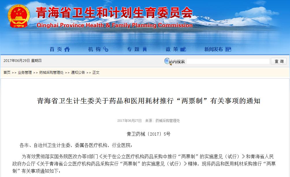继陕西省之后,又一省份落地医用耗材“两票制”。 青海省耗材“两票制”出台 近日,青海省卫计委药械采购管理处对外发布《关于药品和医用耗材推行“两票制”有关事项的通知》(以下简称《通知》),就药品、耗材“两票制”的界定、票据管理、落地保障措施等作出了规定。