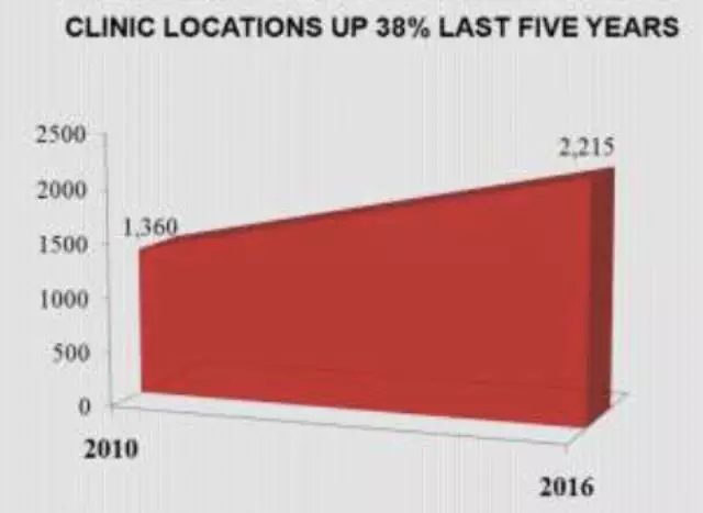 然而,LDT在欧盟市场的增长可能会限制欧盟癌症分子诊断市场的增长机会。近几年,CE认证的癌症分子诊断试剂盒覆盖范围虽然更广,但却没有转化为市场的稳健增长。不过市场的前景还是看好的,因为地区政治恢复稳定,经济环境改善,且先进LDT服务需求增加(相应地促进了相关试剂和仪器的销售)。从全球范围来看,癌症分子诊断是一个高速增长的细分市场,然而,由于欧盟市场的成熟度(相对于世界其他市场)和报销限制(相对于支付系统更多元化的美国市场)的缘故,预期只有近4%的增长率。 4.零售健康诊所及紧急护理中心 美国紧急护理中心(10,000+)和零售诊所(1,200+)的扩增(如图所示)使得能够处理这些诊所相关工作的系统成为头等大事。紧急护理中心为急性疾病与损伤提供了无需预约、可延时的护理服务,这超出了典型初级保健服务的范围或可及性。紧急护理中心(UCC)与传统医生办公室不同,后者常附带损伤骨折手术室、X光照射室,有时还有实验室。充足的停车位也是紧急护理中心商业模式的一部分,因此它们通常位于独立建筑,不过它们也可位于商场,有时也可能设立在综合医院内,但有独立的入口。时间便利性是紧急护理中心的主要优势。