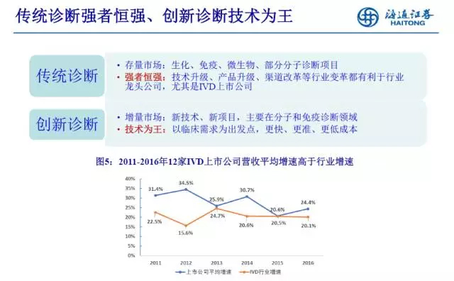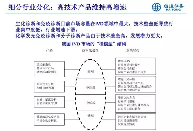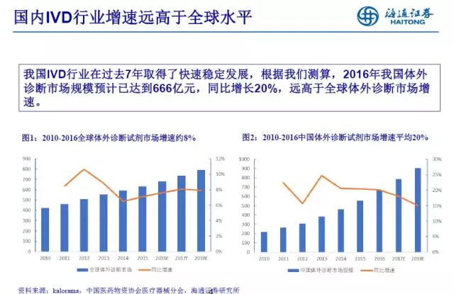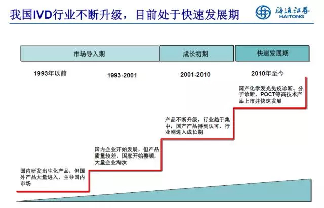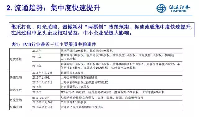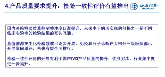 产品的质量要求逐渐提升,检验的一致性评价有望推出。因为药品在资本市场上如火如荼,目前药监局执行力无比强大,从来没有低于预期,基本上每个周五都是政策时间。所以我们认为,从药品领域曾经发生过的,无论是生产端还是流通企业整合度提升,很多政策法规都会不断地复制到IVD产业中来。所以我们认为这个产业未来无论对于生产企业还是销售企业,大家都面临非常大的挑战和机遇。