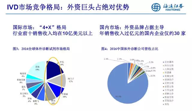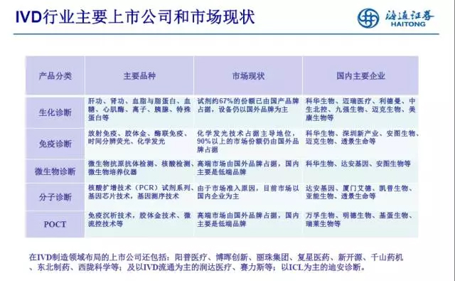 目前IVD的市场格局,外资企业占据了绝对优势,国际市场目前是4+X的格局,包括罗氏在内前四家公司占比非常高,像罗氏占到全球接近20%。在中国市场来看,目前外资品牌占到了非常主导的地位,年销售过亿的企业应该是30家左右,包括目前留给国内市场的进口替代空间是非常大的。目前如果按照细分的类别,分成生化、免疫、微生物、分子诊断、POCT,这五大类别中有很多公司已经或者即将登陆资本市场,已经登陆资本市场的公司大家都比较熟悉,包括最近上市的华大、贝瑞和康速度都非常快。包含以前老的一些公司也在不断地潜入到这些领域。目前大家都知道的,我们最看好的应该还是在化学发光以及分子诊断,包括POCT这三个领域,对于传统生化领域竞争非常激烈,基本上是红海的状态,所以资本市场可能给予的估值相对低一些。