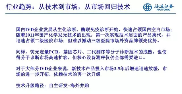 IVD行业当前发展趋势 对于目前行业发展的趋势来讲,从技术到市场,从市场回归技术。事实上整个POCT国内企业的发展,从生化、酶疫免疫诊断开始,快速占领国内空白市场。随着技术的进步以及各家企业飞速的发展,导至国内分子诊断发生了很大的扩容,但问题是核心测序设备和测序仪还是需要进口的。所以目前我们整体认为对于大IVD公司来讲,它不像药,一个大的药企一款药就能卖20亿、50亿,但其实IVD企业很难做到这样。行业不一样,就决定了我们看到的IVD公司,资本方永远希望你能够非常快的推出新产品,老一代产品进行迭代和技术升级。因此这跟一个传统的药企看的投资思路就会不大一样。所以一个药企销售的护城河尤其重要,对于IVD企业,销售相对来说不是那么侧重,很多企业都是代理的模式,我们对于技术的换代和更新速度是最为看中的。