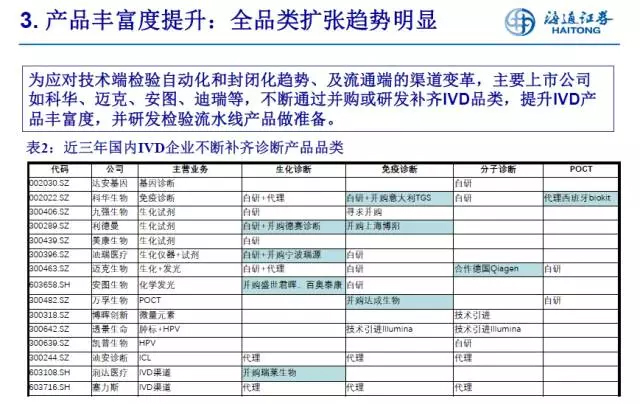 目前产品的丰富度在提升。非常明显的是在IVD行业中,为了应对技术端检验自动化跟封闭化大的趋势,主要的上市公司,像科华、迈克、安图、迪瑞等,不断通过并购或研发补齐IVD品类,提升IVD产品丰富度,并研发检验流水线产品做准备。