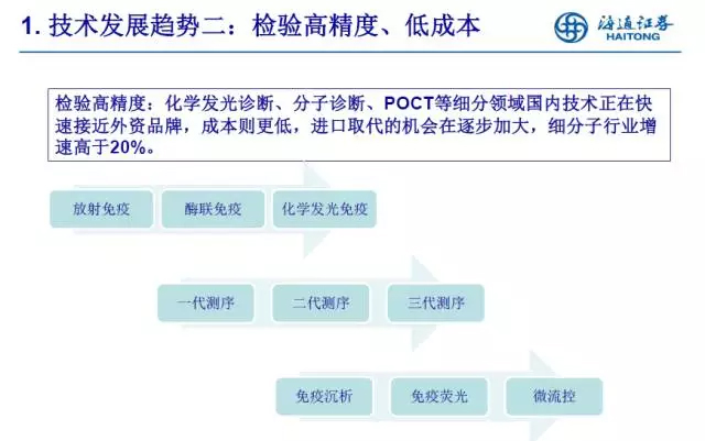 第二是检验越来越追求高精度、低成本,无论是传统领域还是基因测序领域,我们对于精准度要求越来越高。在满足精准度的同时医院是降低成本,同时企业也在研发新的产品达到这个目标,能够快速检测,达到要求。