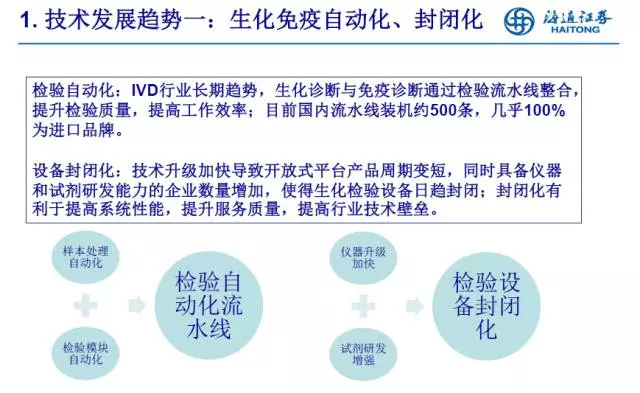 技术发展趋势之一,是生化免疫自动化和封闭化,尤其是很多外资企业推行的路径,也逼迫国内很多企业走向了这条路径,尤其是设备封闭化,包括罗氏等,很多企业都使得开放式平台周期变短,使得竞争格局非常激烈,对我们也是一个比较大的挑战。事实上带来了整个行业技术壁垒不断上升,我们也看到很多公司在这方面做了大量布局。