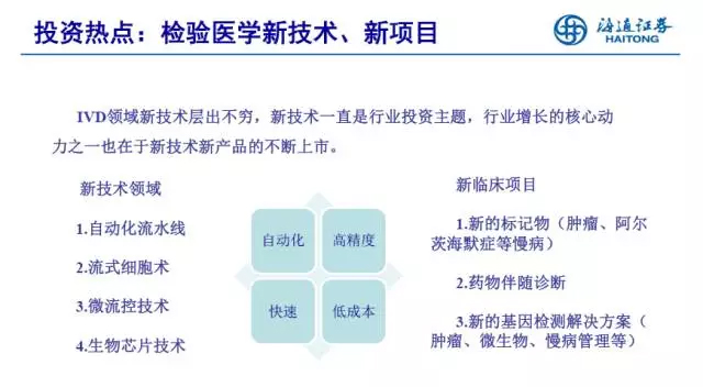 IVD领域投资热点,检验医学新技术、新项目。IVD领域新技术层出不穷,新技术一直是行业投资主题,行业增长的核心动力之一也在于新技术、新产品的不断上市。