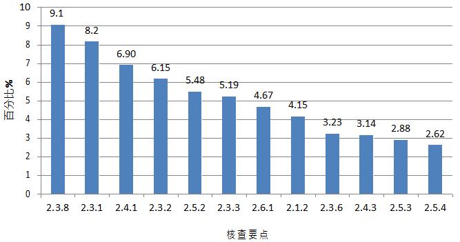 图 1. 核查缺陷分布情况 其中,在对临床部分现场核查发现的4583项缺陷汇总分析,频次最高的缺陷条款如下图: