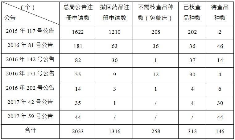 表 1. 药物临床试验数据自查核查相关公告 二、品种填报及撤回情况 截止到 2017 年 6 月底,总局共发布 7 期公告,决定对 2033 个已申报生产或进口的待审药品注册申请开展药物临床试验数 据核查。其中,申请人主动撤回的注册申请 1316 个,占 64.7%; 申请减免临床试验等不需要核查的注册申请 258 个,占 12.7%(见 表 2)。