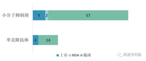 2、EGFR靶向药物以小分子抑制剂类居多 针对EGFR开发的分子靶向药物主要分为两类: 1)单克隆抗体类18个,如西妥昔单抗和帕尼单抗,可以与EGFR胞外区结合,阻断依赖于配体的EGFR活化。 2)小分子抑制剂类68个,包括小分子酪氨酸激酶抑制剂(EGFR-TKls),可以抑制EGFR胞内区酪氨酸激酶活性;以及小分子多靶点受体酪氨酸激酶(RTKs)抑制剂。