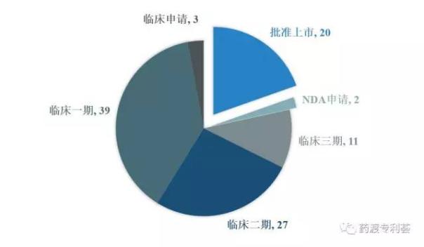 1、全球上市及临床在研EGFR靶点药物品种102个 截至目前,全球(中国、欧美、日韩等主要国家)批准上市的针对EGFR靶点的药物20个,临床申请及研究阶段药物80个,NDA申请中的药物2个。