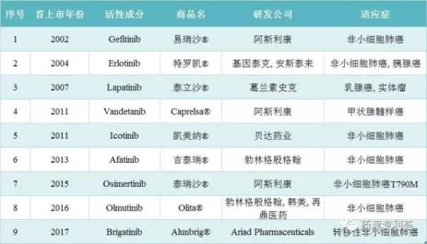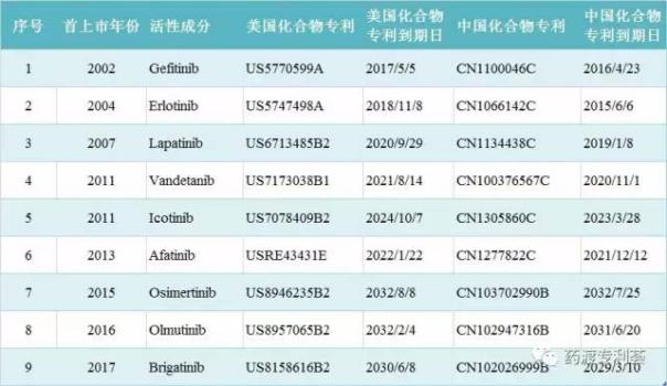 在美国,8个上市EGFR小分子抑制剂药物有化合物专利保护,吉非替尼Gefitinib正面临专利悬崖。 在中国,厄洛替尼Erlotinib和吉非替尼Gefitinib两个重磅药物均已失去化合物专利保护。