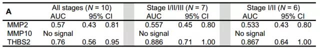 三个蛋白对健康人和PDAC患者的区分的AUC值,AUC的计算为ROC曲线下的面积,范围在0.5-1之间,0.5~0.7时表示准确性较低,0.7~0.9时准确性一般,0.9以上表示准确性较高,AUC=0.5时,说明诊断方法完全不起作用,无诊断价值,<0.5不符合实际情况,极少出现 在确定了THBS2有可能成为新的PDAC标志物后,研究人员随即在两组患者中进行了验证实验。在第一组(phase 2a)的189名患者中,研究人员将THBS2与传统使用的标志物CA19-9做了对比,他们发现,在不分期的PDAC和早期PDAC的诊断中,THBS2的AUC值分别为0.842和0.832,而CA19-9为0.846和0.845,这样来看,似乎CA19-9还略胜一筹? 但是这枚“老牌肿瘤标志物”是由有不小的局限性的,首先,它并非在胰腺癌中特异存在,在结直肠癌、食道癌和肝癌等中也会异常增加。其次,在非癌变的胰腺炎和胆管炎中,CA19-9同样增加,因此,可能会出现不少假阳性情况。过去的研究显示,CA19-9敏感度在69%以上,特异性为78%,美国临床肿瘤协会曾提出,不建议将CA19-9作为单独的胰腺癌鉴别指标[7]。