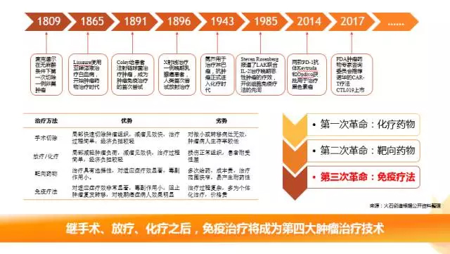 免疫治疗成为第四大肿瘤治疗技术 自人类首次认识肿瘤以来,先后开发了手术切除、化疗、放疗等治疗手段。然后随着肿瘤学与免疫学发展的不断深入,围绕人体免疫系统来治疗肿瘤逐步被接受。2013年《Science》将肿瘤免疫治疗评选为年度十大科学突破之首。 在现代肿瘤学的百余年历程中,先后实现了三次革命性的突破。第一次是细胞毒性化疗药物的发现,改变了肿瘤治疗依靠手术和放疗的局面;第二次是靶向治疗,提高了抗肿瘤药物的治疗指数,为精准医疗奠定了基础;第三次就是调动患者全身天然免疫功能的免疫疗法。
