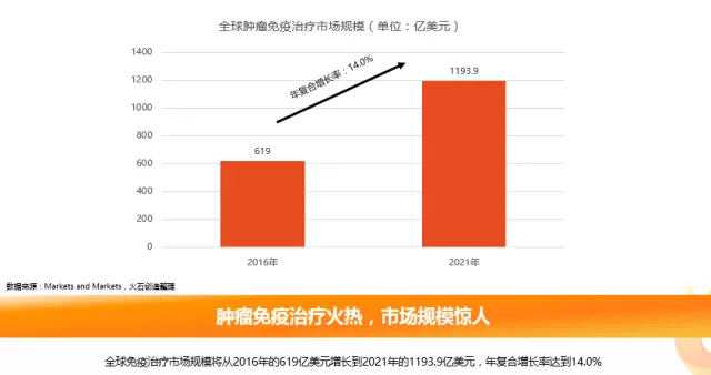 基础研究突飞猛进,加之大量临床转化的加速推进,及相应的监管法规的进步与健全,为行业的发展保驾护航。据Markets and Markets的数据预测,全球肿瘤免疫治疗市场规模将从2016年的619亿美元增长到2021年的1193.9亿美元,年复合增长率达到14.0%。