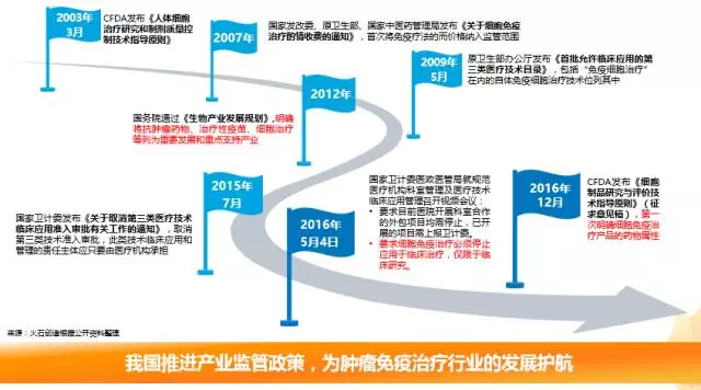 我国政策趋紧,产业监管逐步规范化 2015年前,国内免疫疗法的临床应用“开着大门,却没有让进”。2015年7月,国家卫计委发布取消第三类技术准入审批,此类技术临床应用和管理的责任主体只由医疗机构承担。 “魏则西事件”后,国家卫计委医政医管局就规范医疗机构科室管理及医疗技术临床应用管理做出规定,其中一条就是要求细胞免疫治疗必须停止应用于临床治疗,仅限于临床研究。