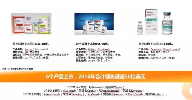 相比另两个,免疫检查点抑制剂是目前应用最成熟的领域,已经有6个产品上市,分别是CTLA-4单抗Yervoy、PD-1单抗Opdivo和Keytruda,及PD-L1单抗Tecentriq、Bavencio和Imfinzi。