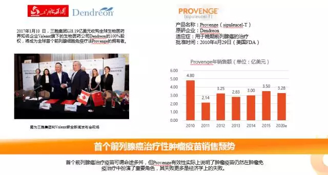目前为止,FDA仅在2010年批准了一个治疗性肿瘤疫苗Provenge,由Dendreon公司原研,用于治疗晚期前列腺癌。Provenge上市第一年销售额达4.8亿美元,而后由于失败的市场推广策略等原因,销售额开始走低,Dendreon公司也因此被Valeant公司收购。 今年1月,国内的三胞集团以8.19亿美元的价格将Dendreon公司从Valeant公司手中收购,成为全球首个治疗前列腺癌肿瘤疫苗的拥有者。Provenge的命途多舛只能说是经济学上的失败,而其有效性已经说明了治疗性肿瘤疫苗在肿瘤免疫治疗中扮演了重要角色。