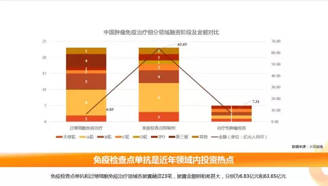 从细分领域获得的融资分析,免疫检查点单抗和过继细胞免疫治疗各披露融资23笔,但披露融资金额则相差甚大,分别为63.65亿元和6.83亿元。