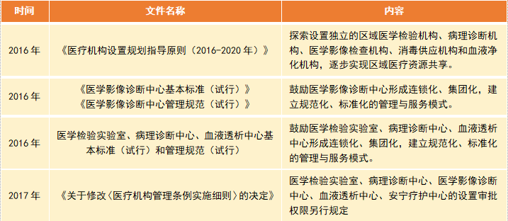 实际上,早在2016年底,国家卫计委就相继发布了医学影像诊断中心、病理诊断中心、血液透析中心、医学检验实验室及安宁疗护中心的基本标准及管理规范。至此,共计10类第三方独立医疗机构被纳入鼓励社会投资范畴。