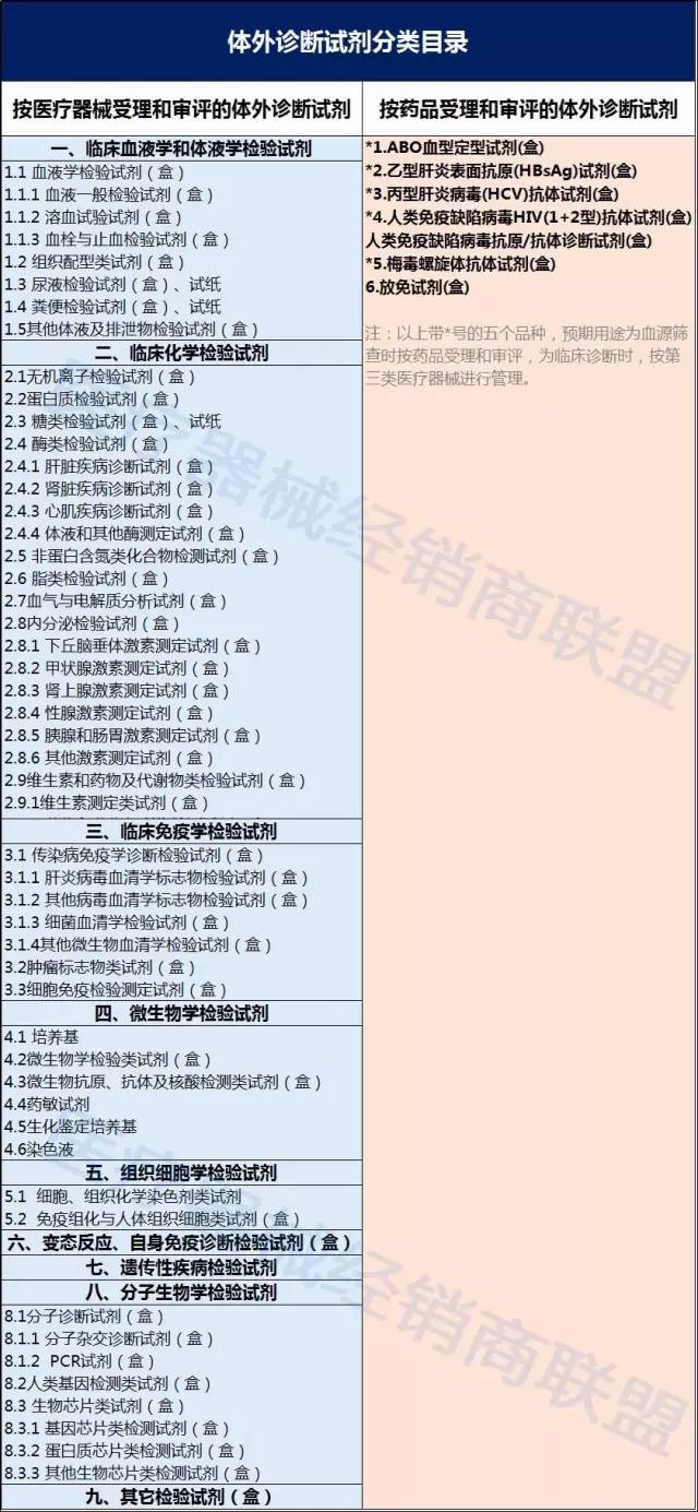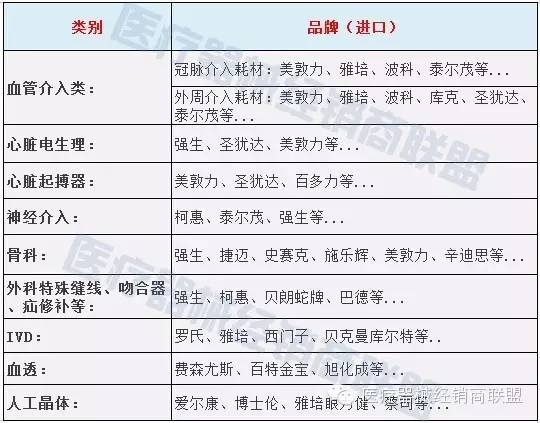 2015-2016年,列入目录中的卫计委集中采购项目。 如上,在2017-2018年,国家卫计委的集中采购项目中新增了甲类大型医用设备。 下面,我们来了解一下这三大重点规范化管理对象。 一、大型医疗设备: 现代医院使用的市值较高、体积较大的医疗设备,有CT、核磁共振、DR系统、CR、工频X光机、推车式B型超声波诊断仪、体外冲击波碎石机、高压氧舱、直线加速器等。 设备分类: 二、高值医用耗材参考目录(部分): 进口高值耗材品牌推荐(部分): 三、IVD(体外诊断试剂) 根据产品风险程度的高低,体外诊断试剂依次分为第三类、第二类、第一类产品。 注: 1、对于第二类产品中的新产品(未在国内批准注册的产品或被测物相同但分析灵敏度指标不在国家已批准注册产品范围内,且具有新的临床诊断意义),采用与第三类产品相同的技术要求。 2、如有不能按照上述原则进行界定的试剂产品,由国家食品药品监督管理局组织界定。 3、国家法定用于血源筛选的体外诊断试剂、采用放射性核素标记的体外诊断试剂不属于本办法管理的范围。 - End - | 编辑:联盟菌 校稿:茱萸 |