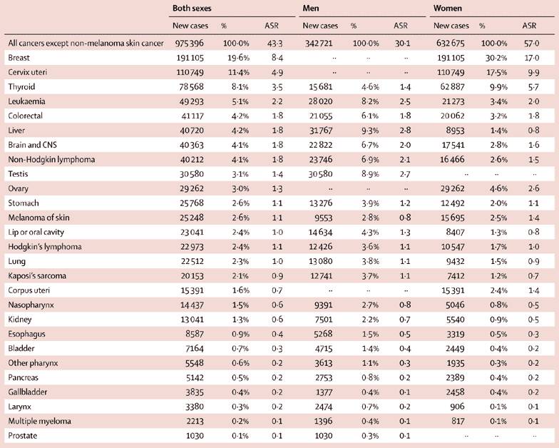 研究人员指出,全球20-39岁年龄段的癌症负担与在更低年龄段或更高年龄段中观察到的癌症负担有所不同。根据年龄、性别、发展水平和地理区域划分的不同,全球20-39岁年龄段的癌症负担呈现出了巨大差异。尽管这一年龄段的癌症负担较更高年龄段的癌症负担小,但是鉴于其对过早发病和过早死亡的影响,其带来的社会和经济影响巨大。为减少这一年龄段的癌症负担,需要实施目标性监测、预防和治疗。 表1. 2012年全球20-39岁年龄段男性和女性中27种癌症的新发病数(ASR,单位:/万人•年)