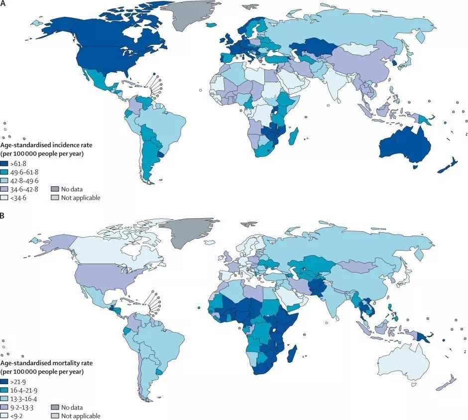 图3. 按人类发展指数(HDI)水平划分,2012年全球20-39岁年龄段5种最常见癌种的新发病及死亡分布比例 图4. 2012年全球各国20-39岁年龄段癌症年龄标化总发病率(A)和总死亡率(B) (单位:/万人•年)