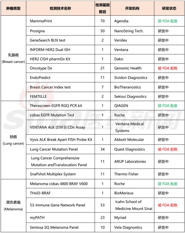 近年来,随着高通量测序及生物信息学分析技术的不断提高,精准医疗的理念逐渐受到关注。2015年1月20日,美国总统奥巴马在国情咨文中提出“精准医学计划”,希望精准医学可以引领一个新的医学时代。 精准医疗本质上是通过基因组、蛋白质组等组学技术和医学前沿技术,对于大样本人群与特定疾病类型进行生物标记物的分析与鉴定、验证与应用,从而精确寻找到疾病的原因和治疗的靶点,并对一种疾病不同状态和过程进行精确分类,最终实现对于疾病和特定患者进行个性化精准治疗的目的,提高疾病诊治与预防的效益。 目前,肿瘤的治疗成为精准医疗的主战场。研究人员已发现,许多分子病变是驱动癌症的诱因,这表明每种癌症都有自己的基因印记、肿瘤标记物以及不同的变异类型。虽然癌症主要是由日常生活中基因损伤积累所导至的,但可遗传性基因变异通常会增加患癌风险。当下,肿瘤的治疗已逐渐告别既往的经验性治疗模式向循证、精准方向迈进。 精准肿瘤学的目标是甄别具有共同生物学基础的患者群体,选择最有可能受益的药物或治疗方式,提高诊治效益。它包括精准预防、精准诊断、和精准治疗。本文以乳腺癌、肺癌和黑色素瘤为例,介绍精准诊断与精准治疗的发展现状,以及面临的一些问题。 1、基因检测 精准诊断不仅能帮助临床医生识别肿瘤的类型和阶段,还能揭示致癌的基因突变,这为精准治疗奠定了坚实的基础。精准诊断的目标包括优化临床结果,避免不必要的治疗,降低治疗副作用,以及避免耐药性的发生。 BRCA1/2基因的发现是精准诊断发展的里程碑事件。BRCA1/2是从一个乳腺癌家系中发现的,研究表明,该基因的突变与乳腺癌有着某种关联。目前,BRCA1/2和其它的乳腺癌易感基因的基因检测,成了肿瘤精准检测的经典范例,全球大约有100万人接受了BRCA1/2突变检测。BRCA1的突变类型大概有1800种,BRCA2的突变类型大概有2000种。在乳腺癌突变基因中,BRCA1/2发生变异的影响要超过tumor protein p53 (TP53)、phosphatase and tensin homolog (PTEN)、liver kinase B1 (LKB1)、cadherin1(CDH1)等基因发生变异的影响。 基因检测已被开发用于肿瘤的诊断、预测和预后等方面,其中一些已经得到食品和药物管理局的批准,而另一些仍在开发中。如表1所示。在乳腺癌基因检测方面,由Agendia公司开发的涉及70个检测基因的MammaPrint,目前已被FDA批准;在肺癌基因检测方面,由QIAGEN公司开发的涉及1个检测基因的Therascreen EGFR RGQ PCR kit,目前已被FDA批准;在黑色素瘤基因检测方面,由Roche公司开发的涉及1个检测基因的Melanoma cobas 4800 BRAF V600,目前已被FDA批准。此外,还有许多检测手段处于研发阶段。 表1 乳腺癌、肺癌和黑色素瘤的基因检测发展情况
