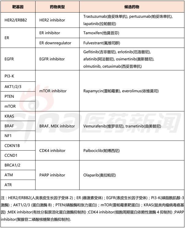 2、靶向治疗 在考虑哪些患者进行靶向治疗以及有效治疗策略的监测时,肿瘤标志物十分关键。它们可以通过监测疾病进展和疗效,鉴别疾病阶段和亚型,以及预后来提高临床诊断的准确性。 在乳腺癌的靶向治疗上,最经典的靶标应该是雌性激素(estrogen receptor , ER)和人类表皮生长因子受体2(HER2),HER2能够与EGFR、HER3、HER4等酪氨酸激酶受体形成异二聚体,HER2的过表达能够诱导乳腺癌的发生。Tamoxifen(他莫昔芬),一种拮抗雌激素的前药,其在肝脏内的代谢中间产物与雌激素具有很强的结合力;Trastuzumab(曲妥珠单抗),一种单克隆抗体,能够HER2相结合,抑制其活性,适用于HER2过表达的乳腺癌患者。目前,乳腺癌其它的的一些靶向治疗药物如表2所示。 表2 乳腺癌的靶向治疗
