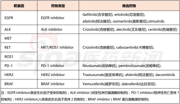 在肺癌的靶向治疗上,靶向药物主要有EGFR inhibitor(表皮生长因子受体抑制剂)、ALK inhibitor (间变性淋巴瘤激酶抑制剂)、BRAF inhibitor (BRAF蛋白激酶激抑制剂)、以及免疫检查点抑制剂,如表3所示。 Gefitinib(吉非替尼),一种表皮生长因子受体抑制剂,因较好的治疗效果,较低的毒副反应,一上市就取代了传统的肺癌治疗药物,成为肺癌的一线治疗药物。但是,几乎所有使用EGFR抑制剂的患者都出现了耐药性,这是因为EGFR 发生了二次突变,比如T790M。因此,针对EGFR易突变的特性,出现了第二代表皮生长因子受体抑制剂,比如afatinib(阿法替尼)。第三代表皮生长因子受体抑制剂,osimertinib(奥斯替尼)和olmutinib也已经分别在美国、韩国上市,它们能够不可逆性地与EGFR T790M相结合。 Crizotinib(克唑替尼),一种ALK、MET和ROS1抑制剂。与传统的化疗药物相比,Crizotinib(克唑替尼)已经展示出对ALK阳性肺癌患者、ROS1重排的非小细胞肺癌患者的疗效、安全性等方面的优势。ALK的某些突变型,比如R1174L、L1196M和R1275Q,会对克唑替尼产生耐药性,这导至了下一代ALK抑制剂的问世,比如,Ceritinib(色瑞替尼)靶向L1196M;Alectinib(艾乐替尼)靶向R1174L、L1196M。 肿瘤细胞通过自身的PD-L1与T细胞的PD1相互作用,来逃避免疫系统的的“监管”,目前,Nivolumab(武纳单抗)和Pembrolizumab(派姆单抗)已被FDA批准用于非小细胞肺癌患者的二线治疗。 表3 肺癌的靶向治疗