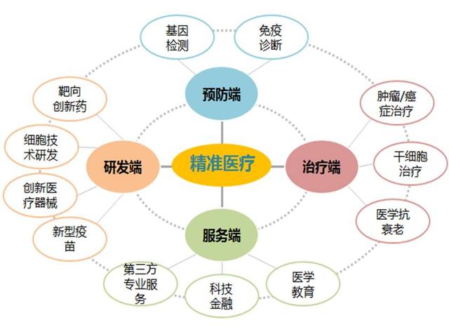 ![]() 前言: 精准医疗(精准医学)是以个体化医疗为基础、随着基因组测序技术快速进步以及生物信息与大数据科学的交叉应用而发展起来的一种新型医学概念与医疗模式。精准医疗代表着医疗健康产业的未来发展方向,从研发、预防、诊断和治疗等方面颠覆了传统医学体系。东滩顾问长期关注精准医疗产业发展,本文对精准医疗产业做了一个较系统的整理,分为"精准医疗的兴起、精准医疗颠覆了什么、精准医疗的产业发展逻辑、精准医疗的产业链创新体系"四个篇章。 一、精准医疗的兴起 二、精准医疗颠覆了什么 三、精准医疗的产业发展逻辑 四、精准医疗的产业链创新体系 精准医疗(Precision Medicine)是以个体化医疗为基础、随着基因组测序技术快速进步以及生物信息与大数据科学的交叉应用而发展起来的一种新型医学概念与医疗模式。简而言之,就是通过对正常人和病例个体的基因测序,对比分析患病情况,针对性利用靶向药物、细胞疗法等治疗手段,精准地对病毒或基因进行打击治疗,从而安全、高效地精准治愈疾病。2015年,美国总统奥巴马在国情咨文演讲中启动精准医疗计划,一期投入2.15亿美元,是希望招募100万名志愿者进行基因组测序,从而拉开了全球声势浩大的精准医疗发展大潮的序幕。 目前,全球生物医药领先的美国、日本、澳大利亚、韩国、英国、法国等国家纷纷布局精准医疗产业,中国也将精准医疗纳入十三五重大科技专项,到2030年拟投资600亿元;同时,产业资本、药企巨头、保险巨头、科技巨头也纷纷以股权投资等各种形式参与精准医疗企业的投资布局,如松禾资本、软银中国、Google、IBM、微软、泰康资产、平安创投、复星医药、三胞集团、罗氏等,以至于目前精准医疗市场规模近600亿美元,2015-2020年期间预计增速可达15%,是医药行业增速的3-4倍;而且随着人类坏境和生活方式的改变,全球重大疾病、亚健康和慢病人群基数庞大,且逐年增长,未来精准医疗的市场客群和服务需求量及其庞大,这也是精准医疗产业被市场广泛看好的另一个有力因素,精准医疗未来的市场潜力确实不容小觑。 ![]() 传统医疗痛点催生精准医疗。传统医疗是在结合临床医生的个人实践经验和客观的科学研究证据,对症状相同的病人使用相同剂量的同种药物进行治疗,但治疗效果千差万别。相关数据显示,运用传统医疗方案,治愈肿瘤的无效率高达75%,治愈糖尿症的无效率为43%。由此可知,传统医疗在治疗重大疾病面前依然束手无策。随着科学的发展和技术的进步,人们也逐步意识到大多数疾病的发生是自身遗传密码和外部环境共同作用的结果。 传统医疗导至用药无效率精准医疗正是在这样的背景下应运而生,充分借助可监测的遗传信息和环境信息,针对个体提供定制的优化治疗方案,提升现有治疗水平,并能在病发之前就有望有效预防。 精准医疗具有定量化、个性化、事前预防和连续性四大特点,是对传统医疗的重要革新,进一步解决了传统医疗的痛点,避免医生由于"只见森林不见树木"导至过度依赖主观经验、描述和循证医学的大众数据,造成对个体的诊疗有效率低、副作用大、事后举措仓促等问题。精准医疗一方面可以提升医疗效率,另一方面还可以降低不合理医疗造成的高昂费用,具有广泛的社会效益。 精准医疗是对传统医疗的颠覆1、诊断:基因测序技术实现精准诊断 从人类发现DNA的双螺旋结构,第一次窥探到生命体如何继承和存储生物信息,到"人类基因组计划"宣布完成,再到高通量测序技术的出现,正逐渐开启"个人基因组"的时代。个人基因组学是实现"精准医疗"的一把利器,而精准医疗的基础便是完成人类的基因组测序。基因测序技术凭借灵敏度高、精度和通量高、价格低廉等优势,成为基因检测技术中获取人体基因组数据的主流技术。 以肿瘤为例,每个肿瘤都有自己的基因图谱。精准医疗就是要借助基因测序技术,准确找到每一位病患的基因变异信息,从而选择恰如其分的治疗方式。肿瘤领域的基因测序是精准医疗最重要的组成部分,其应用将覆盖肿瘤的易感基因检测、早期筛查、疾病确诊、个性化用药指导、随诊与疗效评价等众多治疗环节。2、治疗:靶向用药实现精准治疗 传统药物治疗对待病人都是对症下药,千篇一律;精准医疗则以大数据分析结果为依据,将病患的内在基因和外在环境结合,为其定制个性化治疗方案,实现靶向用药。 以肿瘤为例,传统肿瘤治疗主要有手术、放疗及化疗三种治疗方式,治疗过程往往既折磨病患身体又折磨病患心理;精准治疗则可以依靠基因测序等技术,有效识别肿瘤细胞与正常细胞之间的差别,有针对性地杀死肿瘤细胞及驱动其生长的细胞群,同时对正常细胞的危害降到最低点。既能通过检测肿瘤靶向药物靶点,实行分子靶向用药,提高用药效率;又能通过临床肿瘤基因组学的研究,筛选并发现不同患者对同种药物治疗存在个体差异的遗传指标,并依据指标实现临床上的差异化用药,提高药物治疗的安全性,进而实现个性化治疗。3、预防:大数据实现精准预防 在医学领域,大数据能使医疗保健及疾病预防更为个性化和精准化,美国加州Scripps Health Centre首席学术专家Eric Topol曾称:医学中的数字化已经势不可挡,数字化与医学的交汇已经不可避免,变革已经在这一交汇的舞台上初见端倪。在推进精准医疗实施的过程中,