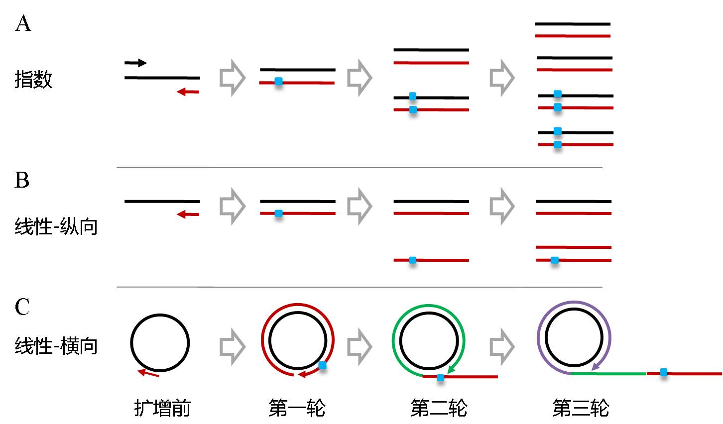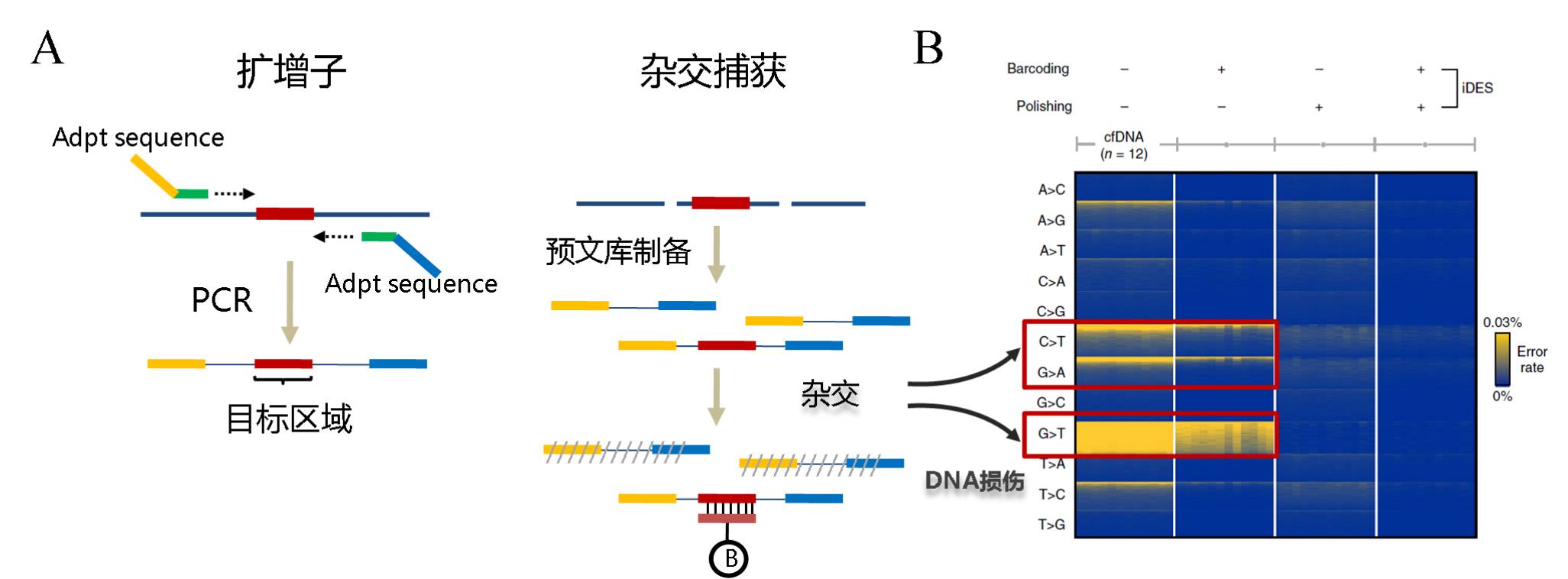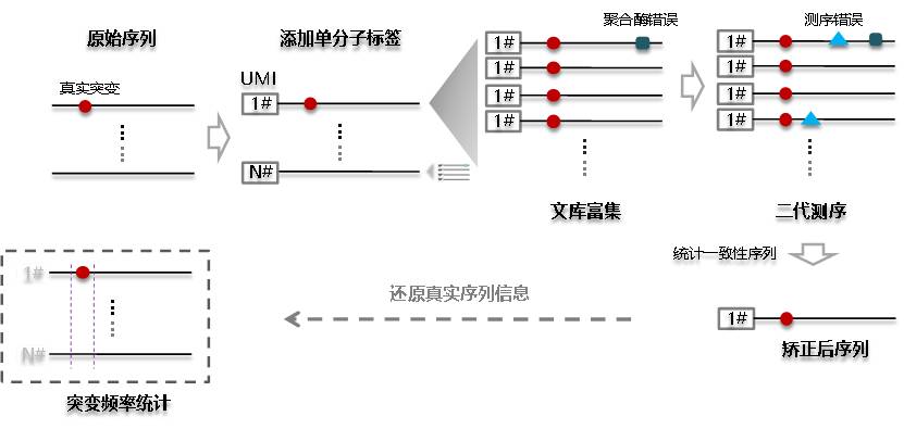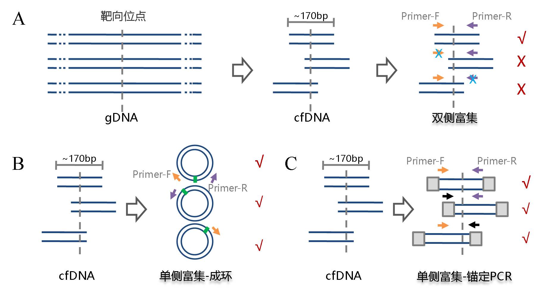 区分ctDNA多以单碱基突变为特征,他们在总cfDNA的含量较低,当测序错误率与ctDNA在cfDNA中占比相当时,比如都是0.1%,在这种情况下,我们无法判断观测到的某个突变是测序错误还是真实存在,ctDNA特有的标记便被淹没在错误噪音中(图2B)。 打个比方,某个坏人躲在人群中,他有两个特点,一是身高一米七,二是蓝眼睛,但是警力有限,只能重点排查,靶向捕获就是先把一米七左右的人找出来,然而我们发现很多一米七的人居然也是蓝眼睛,究其原因可能一些普通人带着蓝色的隐形眼镜,得先把隐形眼镜摘掉才能进一步判断,这里说到的蓝色隐形眼镜就是液态活检的噪音。 图3:液态活检流程中产生的背景噪音 利用二代测序进行液态活检的检测流程也可理解为一种靶向测序技术,通常我们指的靶向测序是对某个感兴趣的基因组区间进行特异检测,比如外显子靶向测序;只是在液态活检中,靶向的基因在肿瘤诊治中具有临床意义,比如靶向用药指导、肿瘤复发监控等。 如图3所示,液态活检技术流程中的噪音源可以细分为三个部分,第一部分来自于靶向捕获技术,也就是在召集身高一米七的人的过程中;第二部分是在文库扩增富集时由PCR聚合酶产生;最后就是测序仪本身的测序错误。前两种噪音属于文库构建层面,可以通过技术优化降低,测序仪的错误是基本固定的,最后,残留的噪音可以通过单分子标记技术进行矫正。下面我们先介绍一下前两种噪音如何产生以及优化思路。 首先,先谈谈靶向富集技术,现在的主流方法有两种,扩增子(PCR)和杂交捕获(图4A),杂交捕获存在两个明显的弊端,1) 实验操作比较繁琐,流程较长,不符合短周期样本的临床检测需求;2)探针杂交过程会对DNA造成损伤,导至碱基突变,噪音升高(图4B)。扩增子技术无探针杂交过程,不会产生额外噪音,操作简单,流程便捷;因此,常被液态活检采用。 图4:A. 两种常见的靶向捕获技术;B. 探针杂交过程产生的背景噪音(节选自[2]) 不过,扩增子技术并不是没有缺点,它靶向检测区域较小,特别是传统扩增子技术存在cfDNA模板丢失的问题,痕量的ctDNA可能趁机溜走。如图5A所示,cfDNA长度~170bp,不能同时被两侧引物覆盖的cfDNA就损失了。 图5:A.双侧引物扩增富集示意图;B. 单侧富集技术之成环;C. 单侧富集技术之锚定PCR 那么,工程师,你看怎么办?工程师:单侧引物富集。之所以说现代分子生物学的技术储备是二代测序得以蓬勃发展的土壤就是这个原因,测序前的样本处理过程,是一个完全开放的平台,研究人员可以运用人类所有的分子技术成果来达成研究目的。 单侧引物富集可以通过两种思路完成,第一,锚定PCR。如图5C所示,在PCR之前,在DNA分子的两端连接上已知序列,这样,即使cfDNA只含有单侧引物的结合位点,也可以与事先连接上的已知序列引物配对,进行PCR富集。第二,先成环再富集(图5B)。与锚定PCR一样,cfDNA分子内成环后,同样可以使用单侧引物富集文库。 如图6所示,我们看到了熟悉的质粒,有没有感觉场景突然被拉回到超净台,不过,这是一种基于克隆构建成环的二代测序技术,称为Cypher-Seq,2015年发表在Nucleic Acids Research杂志,在Cypher-Seq技术中,Illumina接头被制备成了载体,插入片段是待研究的目的DNA,可检测频率低至2.4x10-7的突变。 图6:低频突变检测技术Cypher-Seq流程示意图[3] 我们注意到上述方法是通过双链进行成环,双链成环有一个弊端,就是分子间的串联现象会比较严重,影响底物利用效率,因此,研究人员往往会选择特异性更强的单链分子内部成环(图7A)。 图7:A. 单链成环具有更强的特异性;B. 两种增强单链连接效率的方法 然而,特异性提高了,单链成环的效率却降低了,主要是因为单链DNA的连接效率是显著低于双链DNA的,所以,解决时就会用到一种伟大的思想,叫“没有机会,那就创造机会”,没有双链,人为制造双链结构。如图7B所示,在2013年,Nature Protocol报道了一种单链DNA连接建库的方法(ssDNA 1.0),该方法通过延长连接时间(过夜)来增加效率,流程非常耗时(4);2017年,Nucleic Acids Research公布了该流程的升级版本,在ssDNA2.0中,研究人员将单链接头改造为部分双链,在底物与接头的单链部分退火后,就获得了期望的双链结构,这时候T4 DNA连接酶的工作效率就非常高了,连接时间被压缩到1小时(5);此外,像Padlock技术一样,加入一段与单链分子互补配对的序列形成双链结构,连接效率也能够得到极大提升,类似的原理都可以用于提高单链连接效率。上面谈到的锚定PCR和成环技术,都是为了提高模板利用率,防止微量的ctDNA在此过程中丢失。 图8:A:传统指数PCR扩增;B:线性纵向扩增;C:线性横向串联扩增 下面,接着介绍噪音来源的第二部分,文库富集过程中,由聚合酶产生的碱基突变。文库富集有两种方法,一是指数扩增,二是线性富集。如图8A所示,指数扩增时,引物会以新合成的DNA为模板进行下一轮二链合成,所以某次突变会积累下去;而线性富集始终保持以原始DNA为模板,某次合成出现的突变不会继承传递(图8B);所以,借助线性扩增,聚合酶的合成错误不会因为指数扩增而被无限放大。 线性扩增又可分为横向和纵向两种,如图8C所示,横向线性扩增以成环的DNA为模板,利用聚合酶强烈的链置换活性(比如phi29、Bst DNA聚合酶等),不停的剥离上一轮合成所产生的二链,得到了横向串联重复的线性模板,横向与纵向线性扩增方式一样,均具有背景突变不会积累的优势(图8C)。phi29聚合酶保