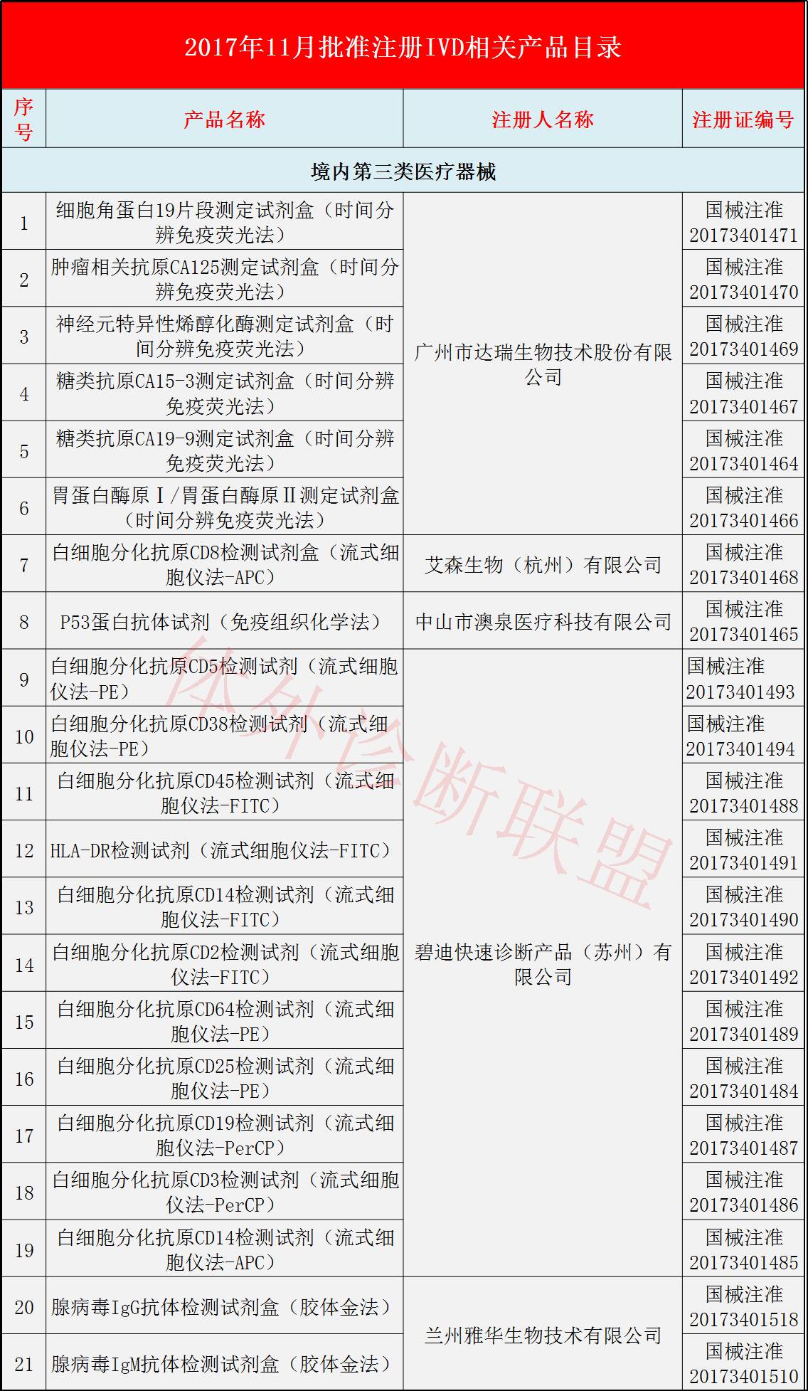 摘要: 2017年11月,国家食品药品监督管理总局共批准注册医疗器械产品114个。其中,境内第三类医疗器械产品87个,进口第三类医疗器械产品13个,进口第二类医疗器械产品14个。根据小V的筛选,11月总局共批准了64件体外诊断相 ...