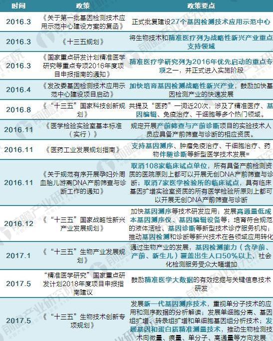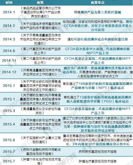 资料来源:前瞻产业研究院整理 2017年中国基因测序行业政策汇总 近几年,国家加快培育生物技术产业,把握我国在新世纪新科技革命的战略机遇,全面建设创新型国家,使得生物行业蓬勃发展,尤其将基因测序作为国家重点领域,加大支持力度,先后推出了多项政策、制度进行扶持,为行业的发展创造了良好的政策环境。短短三年时间,我国基因测序就经历了从无监管、到叫停、到试点申报、再到取消试点限制的一系列历程,可谓是政策发布最为频繁的行业之一。 2014年以前,我国基因测序行业处于无监管状态,基因测序设备基本完全进口国外设备,基因测序服务主要是无创产前基因测序基本由华大基因和贝瑞和康两家垄断。 2014年2月,CFDA和国家卫生计生委联合发布通知,宣布包括产前基因测序在内的所有医疗技术需要应用的检测仪器、诊断试剂和相关医用软件等产品,如用于疾病的预防、诊断、监护、治疗监测、健康状态评价和遗传性疾病的预测,需经食品药品监管部门审批注册,并经卫生计生行政部门批准技术准入方可应用;已经应用的,必须立即停止。 2014年3月,即基因测序叫停一个月后,卫计委发布《关于开展高通量基因测序技术临床应用试点单位申报工作的通知》。通知要求已经开展高通量基因测序技术,且符合申报规定条件的医疗机构可以申请试点,并按照属地管理原则向所在省级卫生计生行政部门提交申报材料,同时明确申请试点的基因测序项目,如产前筛查和产前诊断、遗传病诊断、肿瘤诊断与治疗、植入前胚胎遗传学诊断等。 2015年政策面逐渐转暖,先后批准了一些大型的三甲医院和有资质的第三方检测中心作为高通量基因测序在遗传病、无创产前诊断及肿瘤诊断方面应用的试点单位。 2016年11月,卫计委发布的《国家卫生计生委办公厅关于规范有序开展孕妇外周血胎儿游离DNA产前筛查与诊断工作的通知》取消了无创产检的临床试点限制。这些举措表明监管层将逐渐有限度地放开一些高通量测序应用较为成熟的领域,在行业经过前期严肃整顿并再次放开后,行业内有竞争力的企业将迎来发展良机。 图表2:2014-2017年我国基因测序行业政策汇总及解读