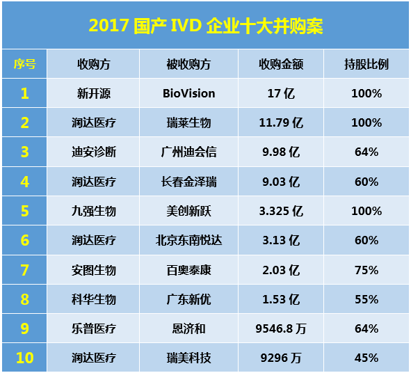 2017年IVD行业上市公司并购数量全年达40家,并购总金额突破60亿元,是2015年的3倍,达到了前所未有的高峰,这意味着这个行业真正迎来了资本整合的阶段。三角君梳理了2017年发生的并购案例,根据并购金额、对行业影响力等因素整理出2017国产IVD企业十大并购案例,供大家参考。 01.新开源17亿收购BioVision公司100%股权
