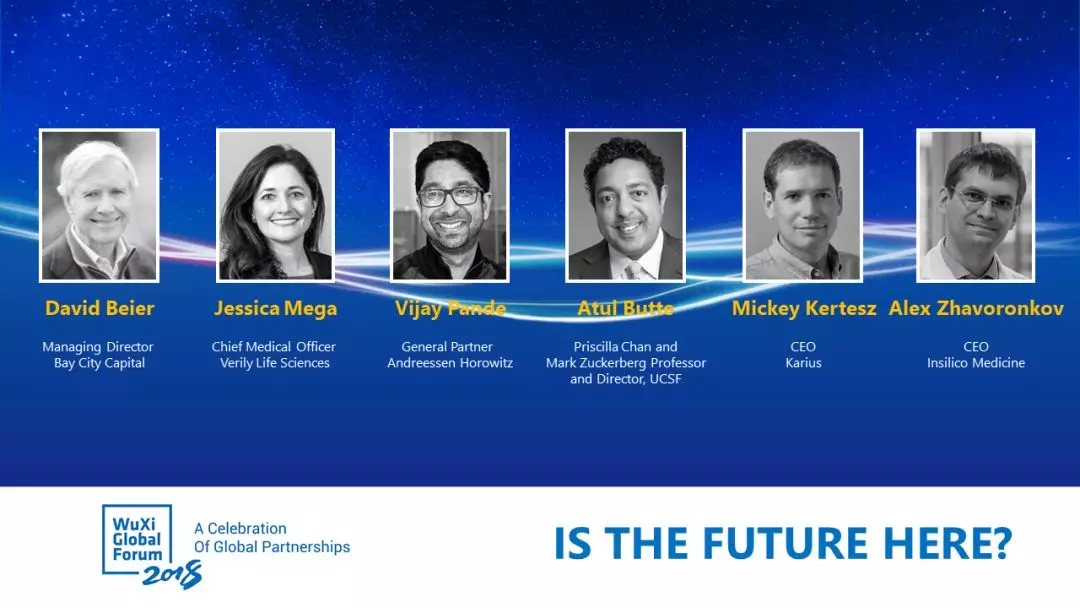 本文转载自“药明康德”,原标题:未来已来? | 药明康德全球论坛实录。 主持人: David Beier博士,Bay City Capital董事总经理 嘉宾: Jessica Mega博士,Verily Life Sciences首席医学官 Vijay Pande博士,Andreessen Horowitz合伙人 Atul Butte博士,加州大学旧金山分校(UCSF)计算健康科学研究所主任 Mickey Kertesz博士,Karius首席执行官 Alex Zhavoronkov博士,Insilico Medicine首席执行官 未来已来? David Beier博士:大家好,这是我们今天的最后一场专题讨论。先请大家简单介绍一下自己,以及和人工智能相关的背景。