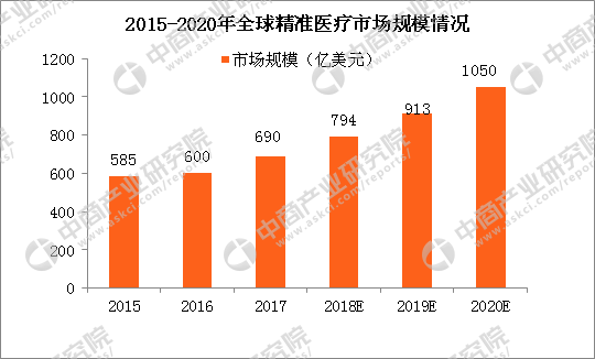 资料来源:公开资料 精准医疗包含诊断和治疗两个方面,“精准”是核心,基因测序是基础。由于导至同一种疾病的原因可能会不同,比如导至肺癌的原因可能会是EGFR、K-RAS、ROSIGF、C-MET等其中一个因子发生变异,不同原因导至的肺癌需要不同的质和量的药物,K-RAS变异引起的肺癌选AKT/PI3K抑制剂,EGFR变异引起的肺癌则选TKIs+化疗的效果更佳。基因测序则是用以精准发现和诊断病因的基础。 二、2020年全球精准医疗市场规模破千亿美元 国际领域精准医疗的建立与发展,源自美国医学界2011年首次提出“精准医学”概念。2015年美国国情咨文中提出“精准医学计划”,预示着精准医学将引领未来医学新时代。 精准医疗所涵盖范畴很广,涉及到多学科的融合。从技术看,还处于研究或临床试验阶段的细胞免疫疗法和基因编辑产业链尚不完整,基因测序的产业链较为明晰。2016至2020年,全球精准医疗市场规模将以每年15%的速率增长。预计2020年全球精准医疗市场规模将破千亿,达到1050亿美元。