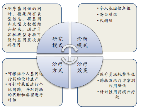 一、精准医疗行业概况 精准医疗是一种将个人基因、环境与生活习惯差异考虑在内的疾病预防与处置的新兴方法,是以个体化医疗为基础、随着基因组测序技术快速进步以及生物信息与大数据科学的交叉应用而发展起来的新型医学概念与医疗模式。其本质是通过基因组、蛋白质组等组学技术和医学前沿技术,对于大样本人群与特定疾病类型进行生物标记物的分析与鉴定、验证与应用,从而精确寻找到疾病的原因和治疗的靶点,并对一种疾病不同状态和过程进行精确分类,最终实现对于疾病和特定患者进行个性化精准治疗的目的,提高疾病诊治与预防的效益。精准医疗的重点不在“医疗”,而在“精准”。从基因科学的历史使命——“人类基因组计划筹备”开始,“基因组学”的概念就被生物系统学家做了很多的研究工作。精准医疗更重视“病”的深度特征和“药”的高度精准性;是在对人、病、药深度认识基础上,形成的高水平医疗技术。 精准医疗的特征分析
