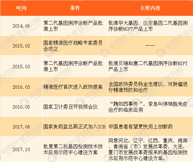 数据来源:中商产业研究院 三、中国精准医疗行业发展迅速 中国早在20世纪初就开始关注精准医学,于2006年首次提出“精准外科”的概念。2014年,第二代基因测序诊断产品批准上市,批准华大基因、达安基因二代基因测序诊断NIPT产品上市。2015年,首届精准医疗战略专家委员会成立,同年3月,第二代基因测序诊断产品批准上市,批准贝瑞和康二代基因测序诊断NIPT产品上市。2016年3月,精准医疗首次进入政协提案。2016年“魏则西事件”将免疫细胞疗法推向公众视野,卫计委紧急叫停细胞免疫疗法的临床应用,更加严格监管措施和相应行业标准将配套产业发展,并推动产业以更健康的方式前行。 2017年6月,国家食药监总局正式加入ICH,中国患者有望更快用上创新药。2017年10月,国家发展改革委办公厅原则同意河北、辽宁、江西、重庆、海南、青海省(市)发展改革委,大连、厦门市发展改革委报来的基因检测技术应用示范中心建设方案。这也标志着由国家发改委牵头建设的基因检测技术应用示范中心建设项目,正式在国家战略层面上快速推动我国基因产业规范化、跨越式发展。 中国精准医疗发展历程