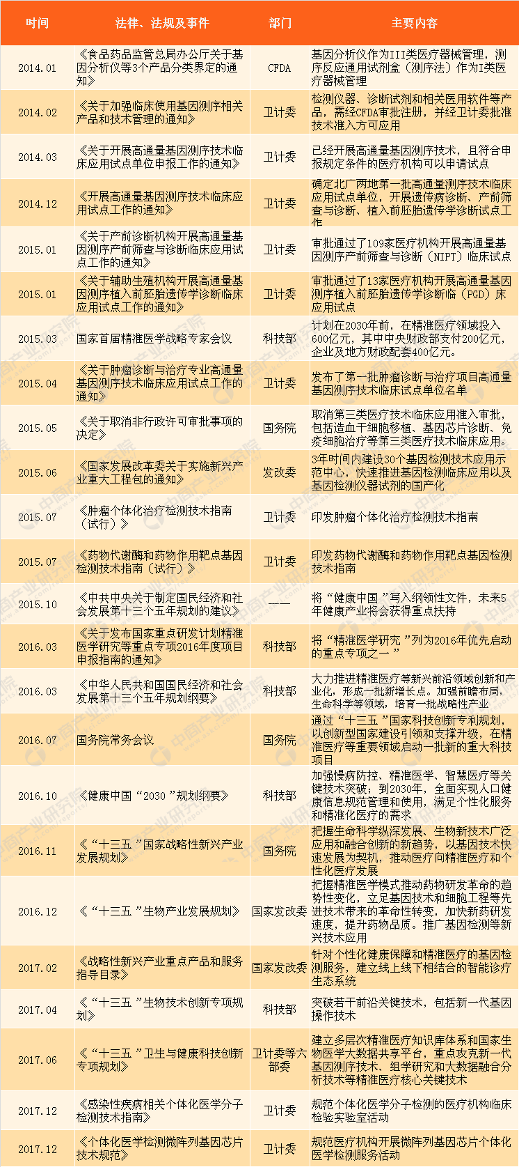 资料来源:中商产业研究院整理 四、国家政策助力精准医疗行业发展 近几年,中国在精准医疗领域发布的政策非常密集,正在加速推进行业监管的跟进。同时,精准医疗国家指南也提出了“队列、大数据、生物标记物、精准预防、精准治疗”等重点方向。 2014年以后,CFDA等机构批准高通量测序在NPIT、PDG等生育健康领域的临床应用试点。计划在2030年前我国精准医疗领域投入600亿元,至此,精准医疗在中国已经上升为了“国家战略”。同年,高通量测序技术得到在肿瘤诊断和治疗上的临床试点,提振分子靶向药物研发生产。5月,国家发改委发文取消第三类医疗技术临床应用准入审批,干细胞、基因芯片、细胞免疫治疗等细分领域得到快速发展。10月,精准医疗被列入“十三五规划”重点发展项目。2016年年底国家发改委正式发布《“十三五”生物产业发展规划》,加快发展精准医学新模式。2017年4月《“十三五”生物技术创新专项规划》发布,基因测序、免疫疗法、AI等“被点名”。同年6月,卫计委等六部委发布《“十三五”卫生与健康科技创新专项规划》,要求建立多层次精准医疗知识库体系和国家生物医学大数据共享平台,重点攻克新一代基因测序技术、组学研究和大数据融合分析技术等精准医疗核心关键技术,开发一批重大疾病早期筛查、分子分型、个体化靶向药物治疗、靶向外科手术、疗效预测及监控等精准化解决方案和支撑技术。2017年年底,卫计委发布《感染性疾病相关个体化医学分子检测技术指南》、《个体化医学检测微阵列基因芯片技术规范》,规范精准医疗活动。 精准医疗政策及法律法规