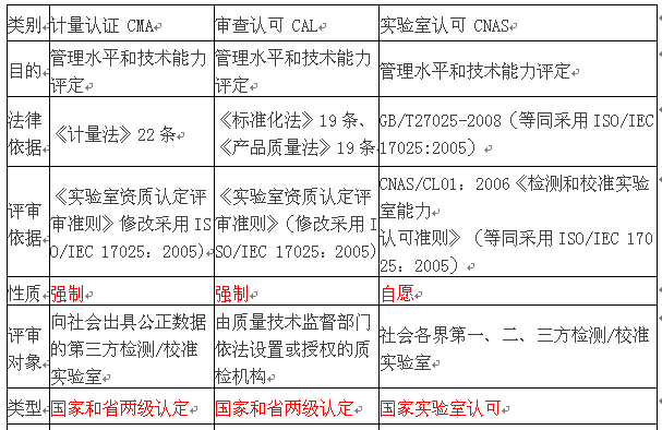 CNAS、CMA、CAL的含义: CNAS标识:表明该机构已经通过了指中国合格评定国家认可委员会的认可。 CNAS:China National Accreditation Service for Conformity Assessment中国合格评定国家认可委员会,"CNAS"标识表明质检中心的检测能力和设备能力通过中国合格评定国家认可委员会认可。 CNAS是什么实验室都可以申请认可,只要你具备相应的检测能力,通过认可就可以发证,包括第一方、第二方、第三方实验室,企业甚至个人实验室等等,范围很广。 CMA:表明该机构已经通过了国家认证认可监督管理委员会或各省、自治区、直辖市人民政府质量技术监督部门的计量认证。 CMA是“China Metrology Accreditation”的缩写;中文含义为“中国计量认证”。它是根据中华人民共和国计量法的规定,由省级以上人民政府计量行政部门对检测机构的检测能力及可靠性进行的一种全面的认证及评价。这种认证对象是所有对社会出具公正数据的产品质量监督检验机构及其它各类实验室;如各种产品质量监督检验站、环境检测站、疾病预防控制中心等等。 取得计量认证合格证书的检测机构,允许其在检验报告上使用CMA标记;有CMA标记的检验报告可用于产品质量评价、成果及司法鉴定、贸易交易等方面,具有法律效力,是仲裁和司法机构采信的依据。 CMA是一般只对第三方实验室,也包括小部分特定的第二方实验室,范围比较小,它一般跟审查认可一起,只有经过政府的授权才有资格。 CAL标识:表明该机构获得了国家认证认可监督管理委员会或各省、自治区、直辖市人民政府质量技术监督部门的审查认可(验收)的授权证书。 CAL是质量监督检验机构认证符号,国家质量监督部门授予的权威性质量监督检验机构使用的授权标志,可以承担国家行政机构下达的法定的质量监督检验任务,也可以出具带有CAL、CMA标志的检验报告。授予前该机构必须经过了CMA计量认证,否则不能授予。 实验室认可CNAS、计量认证CMA和审查认可CAL的主要区别: |
